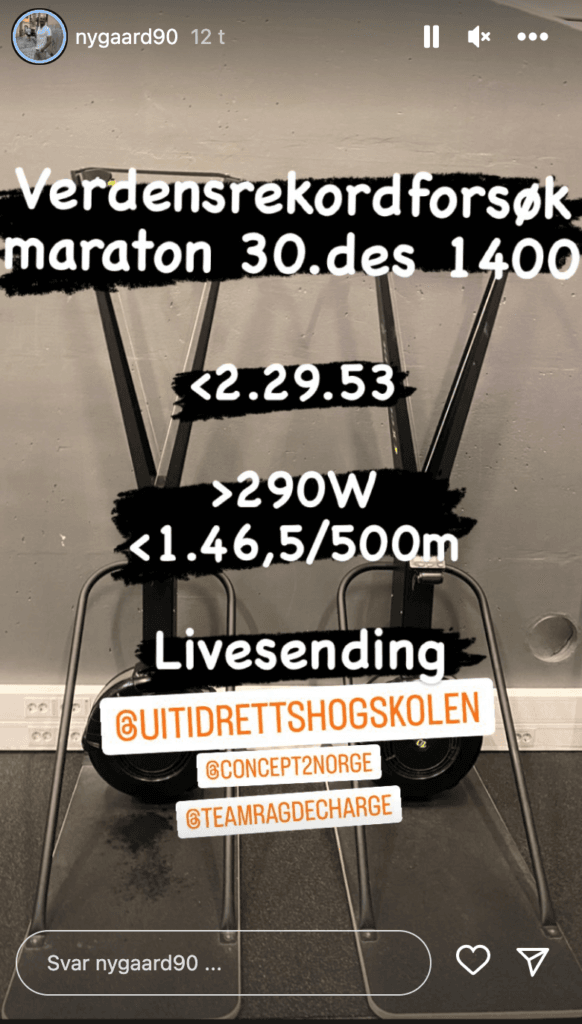 Tiden han brukte på sine 42 195 meter på SkiErgen, og som Nygaard nå skal prøve å slå er: 2:29.53,5.