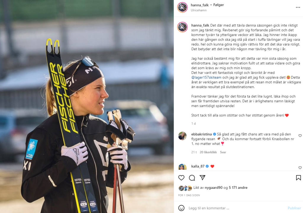 Hanna Falk gir opp sin langløpssatsing og legger skiene på hyllen. Det har vært en meget trøblete sesong for den tidligere sprinteren fra Ulricehamn.