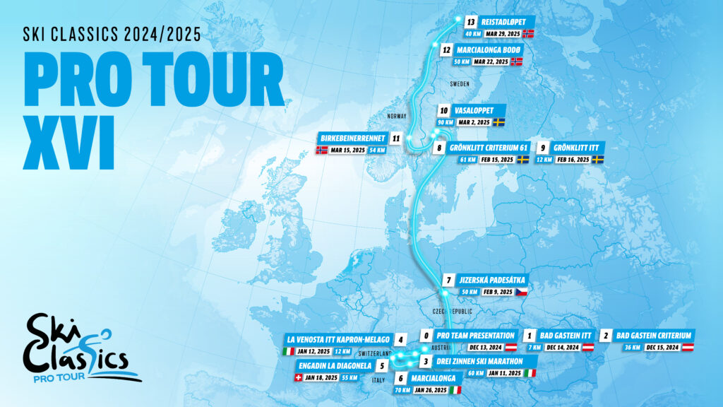 Sesong XVI av Ski Classics Pro Tour består av 14 renn på 10 arrangementshelger i 6 forskjellige land. Sesongen starter 13. desember 2024, og slutter 30. mars 2025, klokka … (skal avsløres; følg med!)