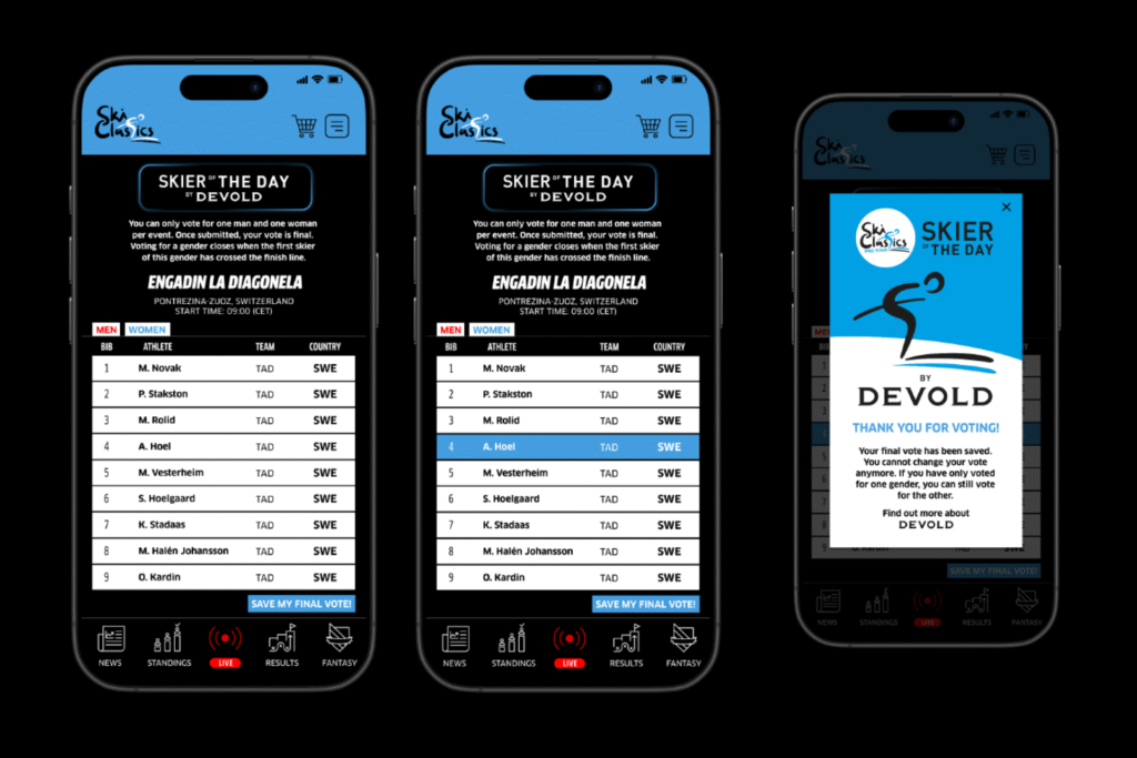 Bli med, støtt dine favoritter og vær med på å forme historien rundt hvert Pro Tour-renn. Last ned appen, følg konkurransene live og stem på Skier of the Day by Devold!
