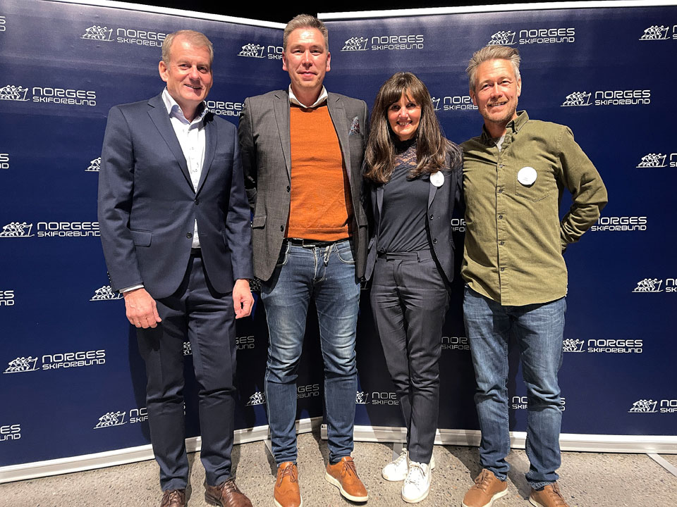Skipresident Erik Røste, Stian Henriksen (Vassfjellet Vinterpark), anleggsrådgiver Marit Gjerland og Stefan Havnelid fra Norges Skiforbund Alpint. Foto: Norges Skiforbund