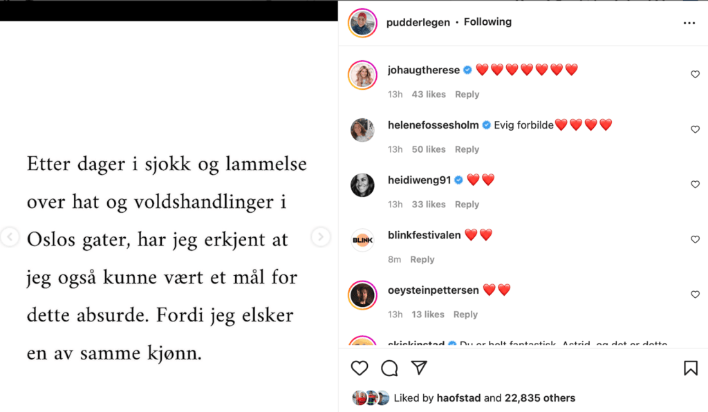 Natt til søndag publiserte Uhrenholdt Jacobsen tankene på sin Instagram-konto, der hun forteller at hun føler seg ekstra truffet av sorgen over angrepet fordi også hun elsker en av samme kjønn.
