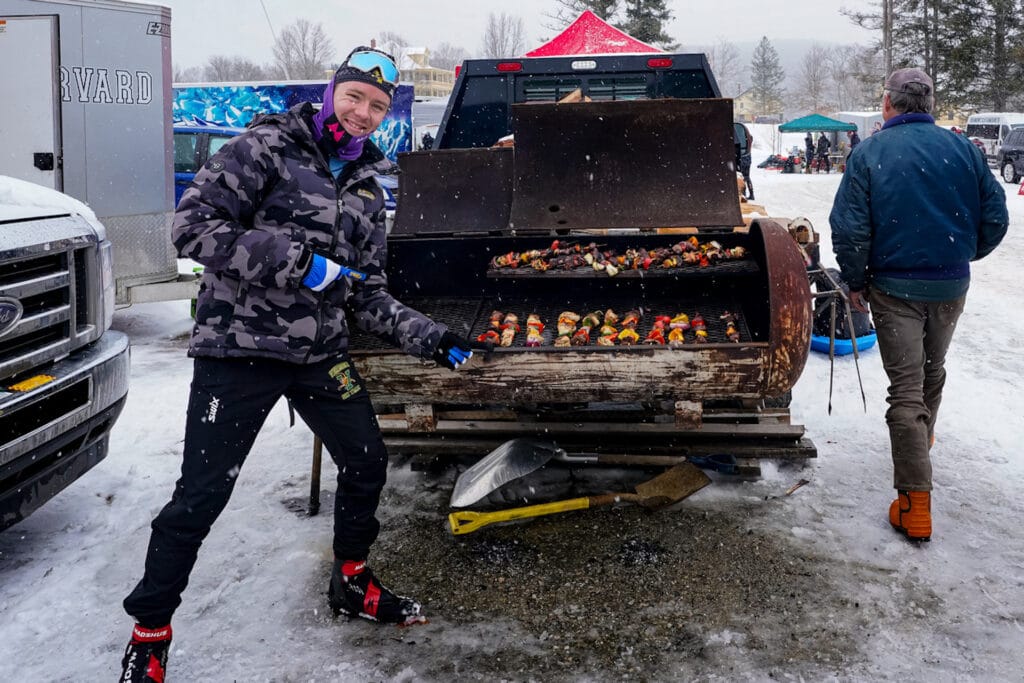 – Og så hadde vi en svær propantank. Den rigget vi opp slik at hele lasteplanet på pickupen er en kjempestor grill. Så under de lokale rennene i vinter fyrte vi den opp, og serverte burgere, spareribs og grillspyd fra lasteplanet. Det var kjempegøy.
