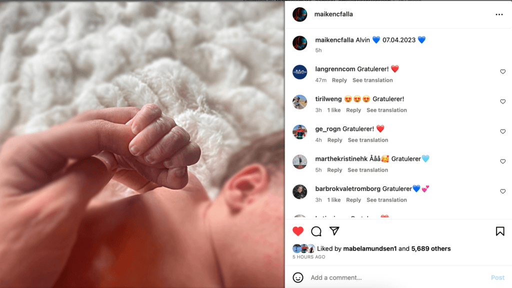 Maiken Caspersen Falla har blitt mamma til sønnen Alvin. Det melder den tidligere OL og verdensmesteren på sin Instagram-konto torsdag kveld.