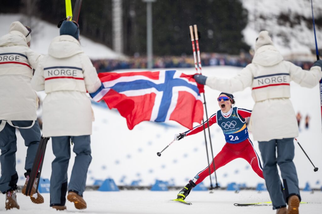 Det norske stafettlaget med Kristin Austgulen Fosnæs, Astrid Øyre Slind, Karoline Simpson-Larsen og Heidi Weng tar Norges første gull på damesiden i årets OL, og første stafettgull i OL siden 2018.