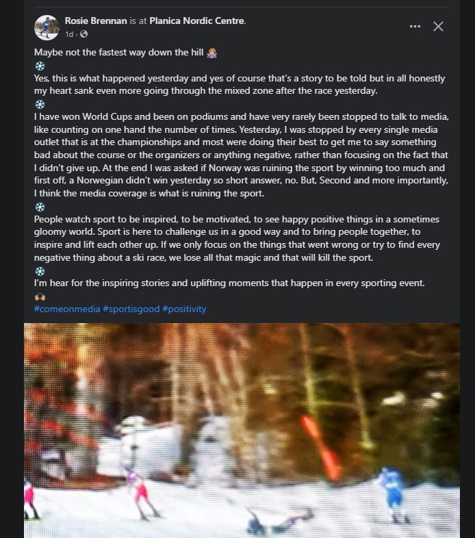 Men Brennan er oppgitt over media, og lei av medias ensidige negative fokus og krisemaksimering i dekningen av langrenn, som hun opplever at fører til marginalisering av utøvernes sportslige prestasjoner.