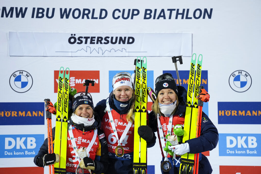 PALLEN på damenes sprint, fr v: Anna Magnusson, Suvi Minkkinen og Oceane Michelon. Foto: NORDIC FOCUS