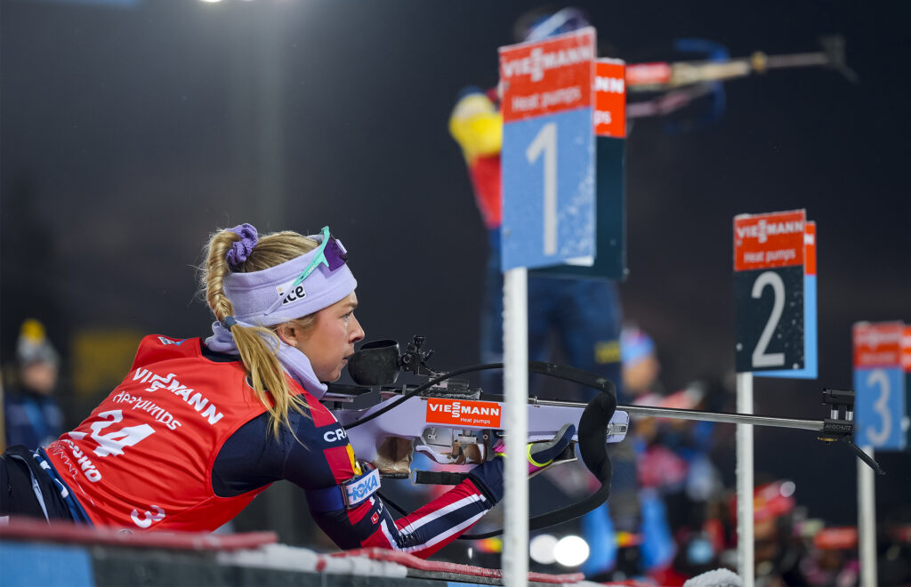 • Ingrid Landmark Tandrevold of Norway during zeroing ahead of women's 10 km pursuit during the IBU World Cup on March 22, 2025 in Oslo. Foto: Mathias Bergeld / BILDBYRÅN