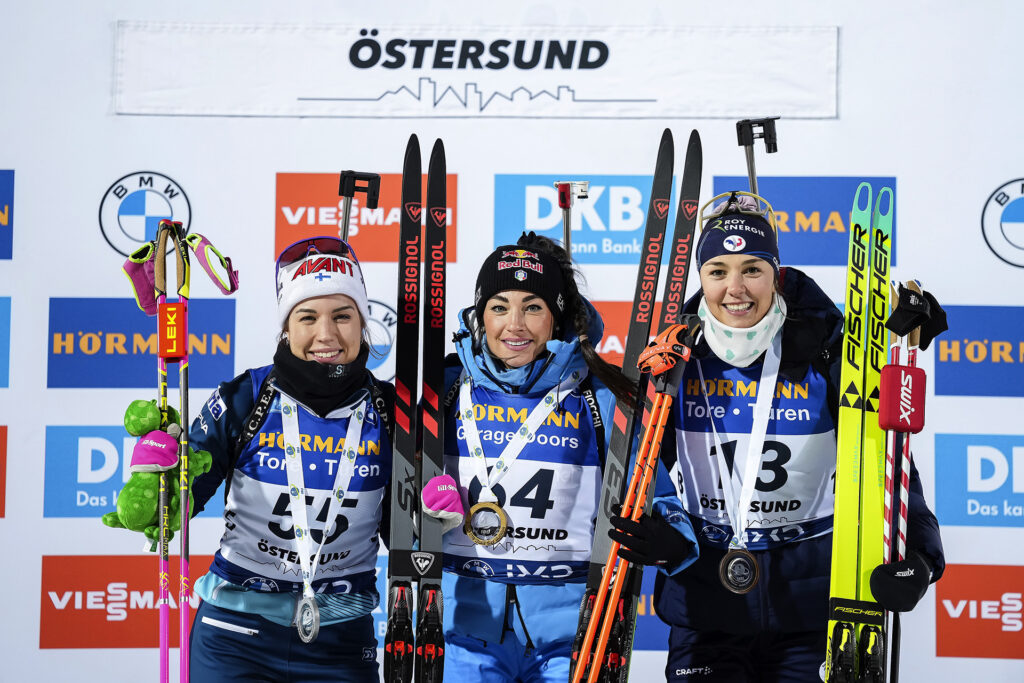 IKKE MANGE hadde tippet denne pallen, fr v: Sonja Leinamo, Dorothea Wierer og Camille Bened. Foto: NORDIC FOCUS