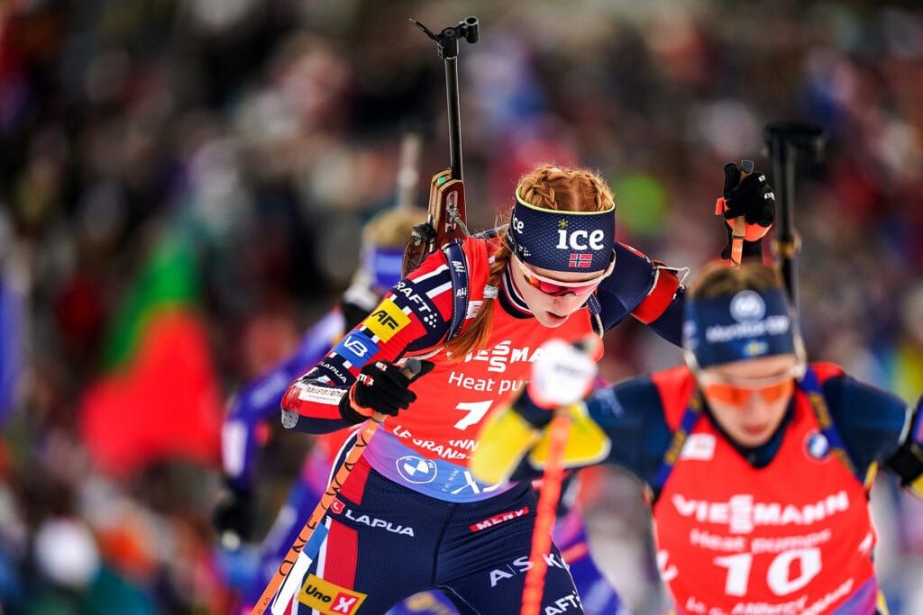 Verdenscupleder Franziska Preuss gjorde akkurat som Johannes Thingnes Bø blant herrene. Holdt unna for jagende franske løpere. Først Justine Braisaz-Bouchet, som dog bommet seg bort, og senere Julia Simon.