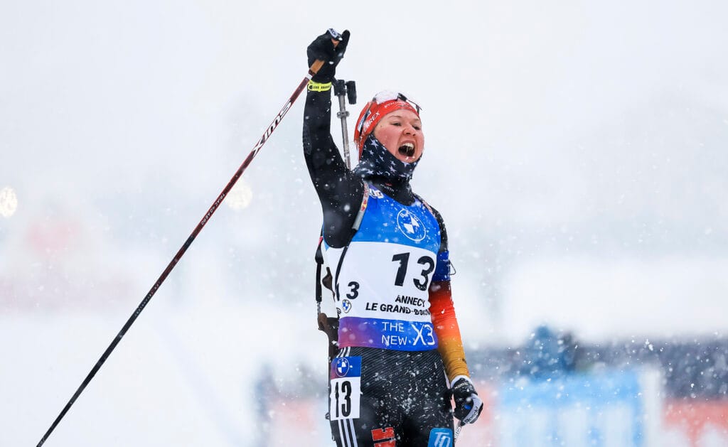 20-åringen har allerede i flere år blitt regnet som den nye, tyske stjernen i skiskyting. Og i et skikkelig grisevær i Le Grand Bornand tok hon sin første verdenscupseier. I fellesstarten viste hun ingen nåde mot sin landslagskollega og verdenscupleder Franziska Preuss.